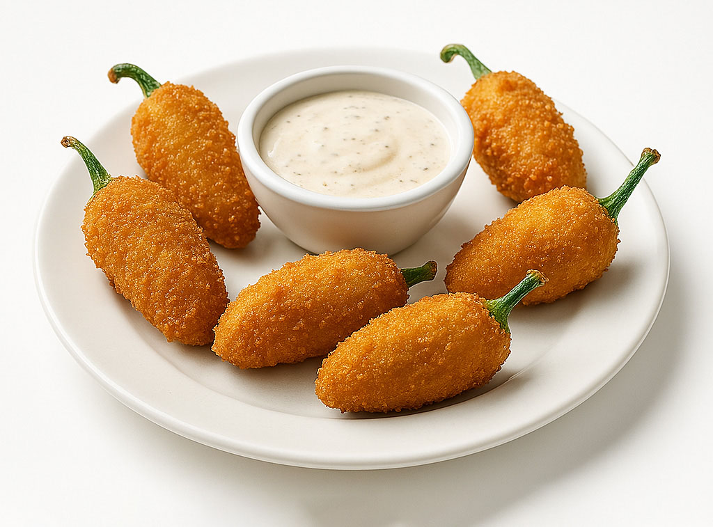 Hickory smoked brisket, Jack cheese stuffed in five hand breaded jalapeños, served with spicy ranch