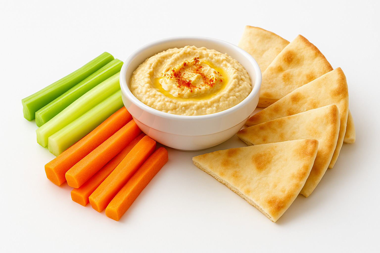 Hummus served with celery, cucumbers, carrots, and warm pita