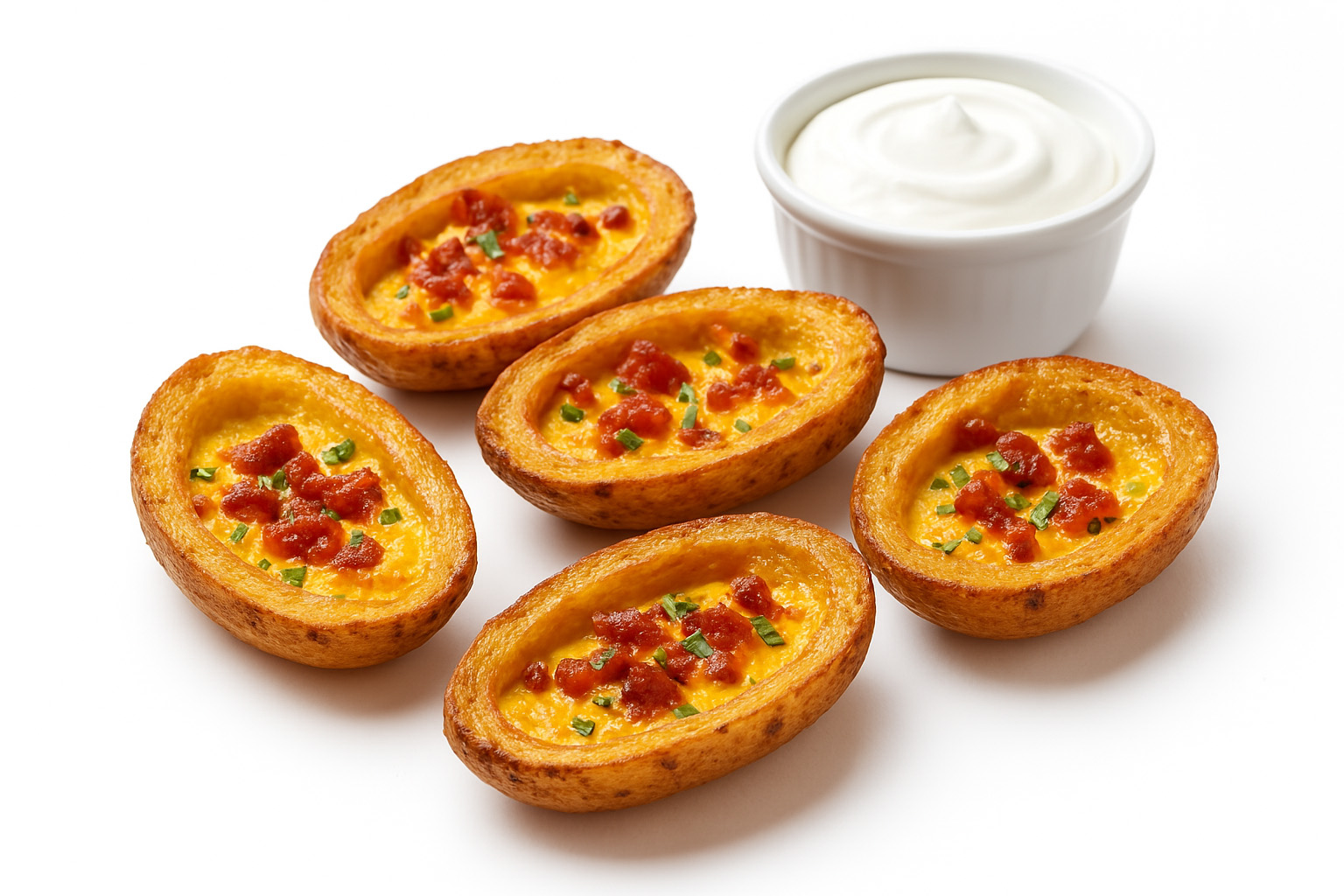 Loaded potato skin with bacon, mixed cheese, green onions, and sour cream